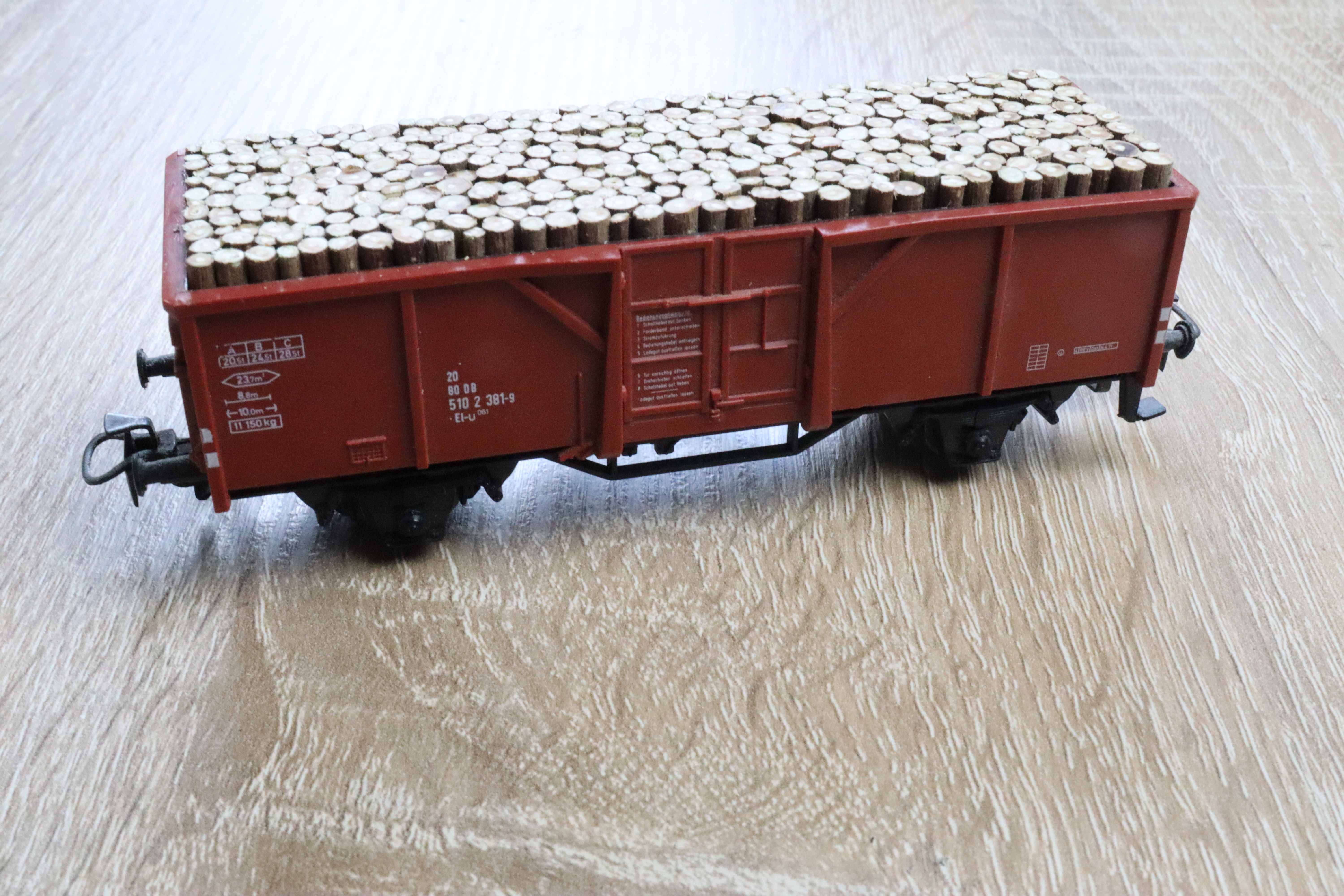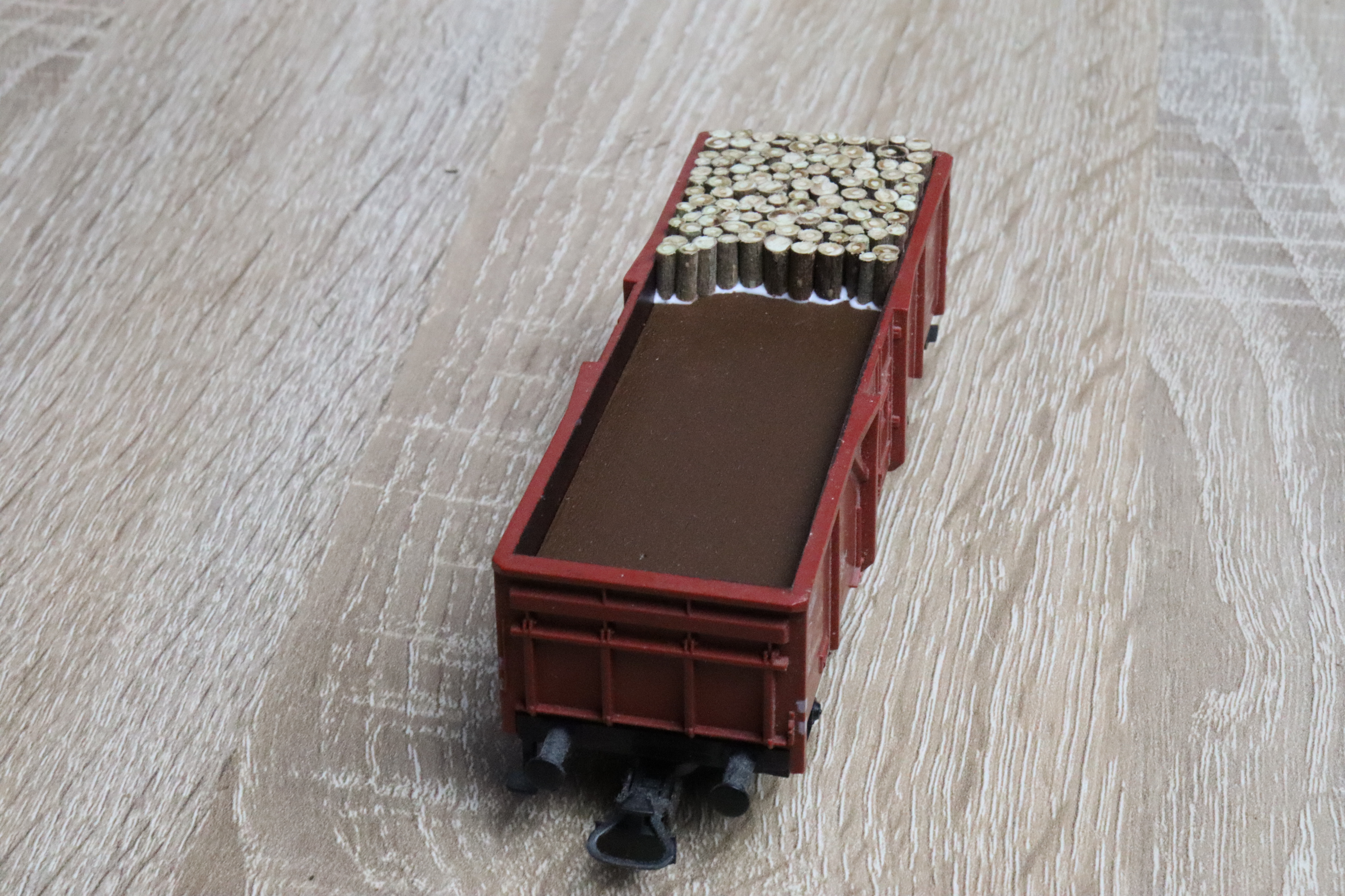 Und schon haben wir uns unseren Güterwaggon mit Holz beladen. Ich finde ein kleiner Hingucker auf der eigenen Modelleisenbahnanlage.